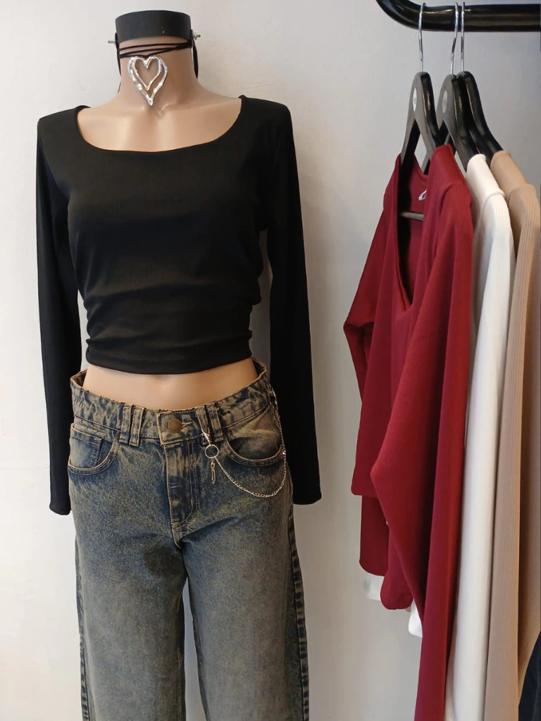 Remera con escote cuadrado, manga larga de morley, calce regular.
